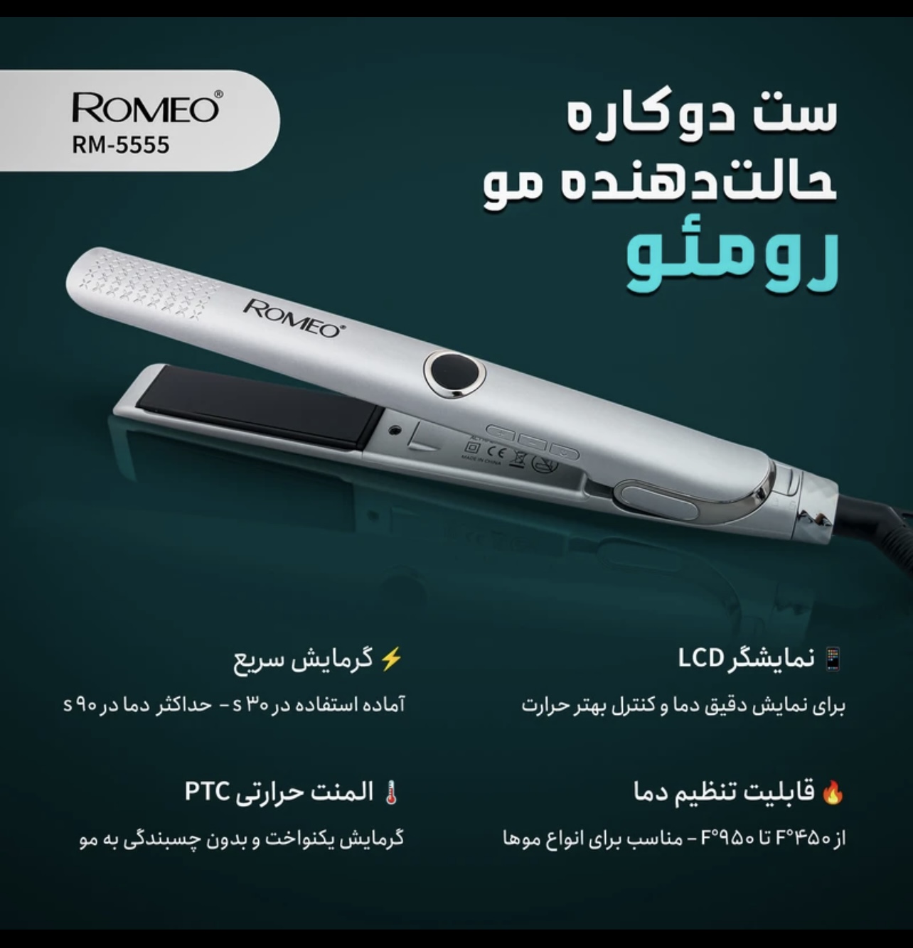 با اتو و حالتدهنده مو حرفهای رومئو مدل RM-5555، به موهای خود نرمی و درخشش بخشید! این مجموعه همراه با فر کننده مو، ابزار کامل شما برای خلق هر استایلی است. طراحی ارگونومیک و حرارت سریع آن، زمان شما را ذخیره کرده و به نتایج حرفهای دست خواهید یافت. با خرید امروز، زیبایی تازهای به موهایتان ببخشید!