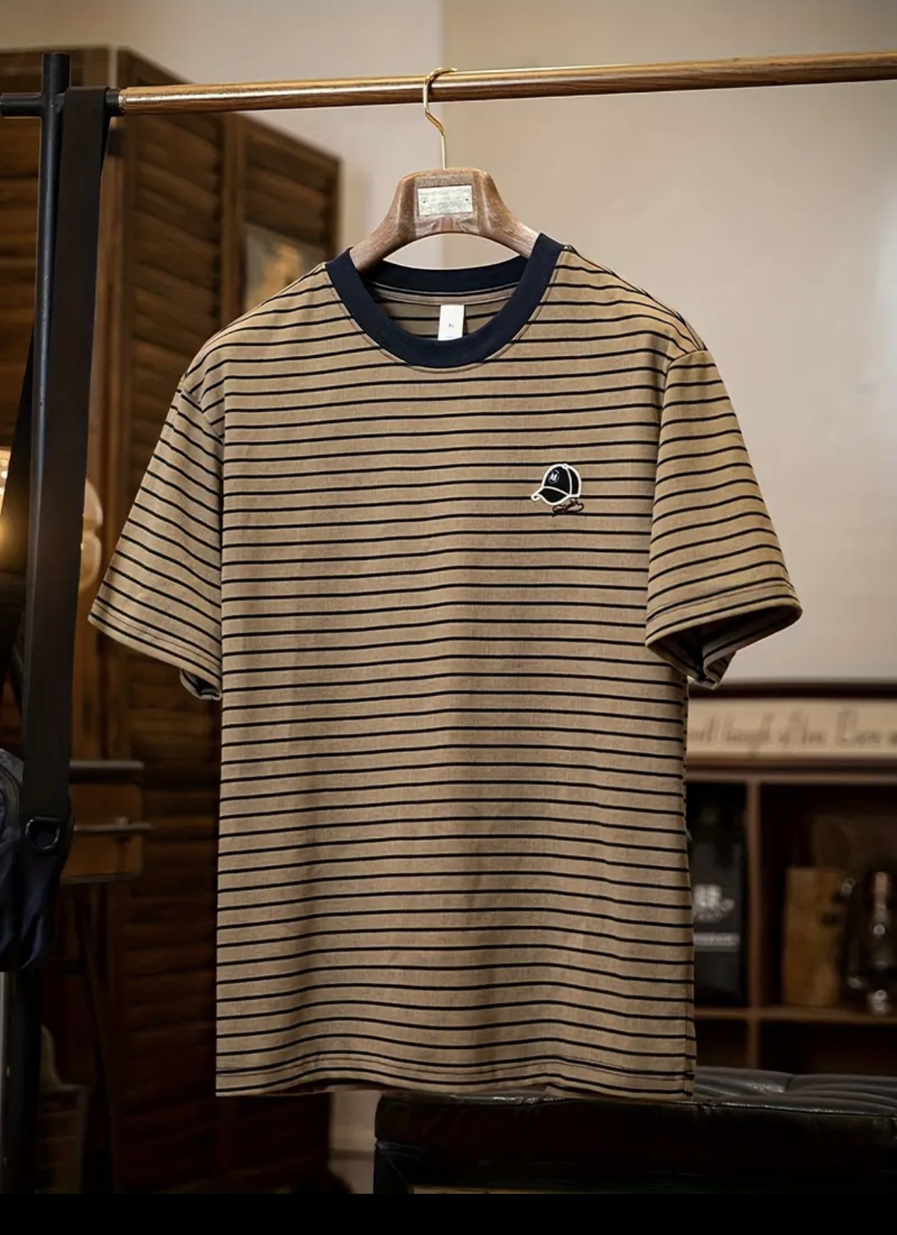 تیشرت راحتی مردانه - قهوهای و سفید راه راه، یقه گرد، آستین کوتاه، لوگو گلدوزی شده، گشاد، جنس ترکیبی پنبه، مناسب برای لباس راحتی تابستانی | تیشرت راه راه | گلدوزی شده